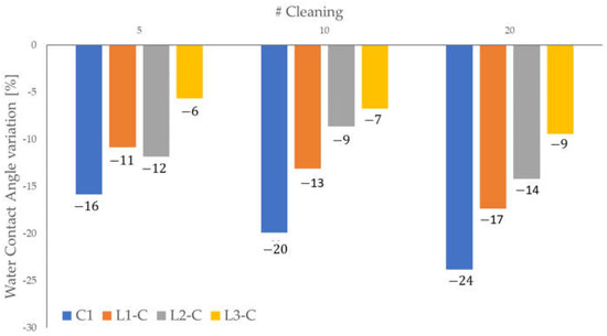 In Table 4, the contact angles measured with water (H2O), diiodomethane (D) and formamide (F) were reported at 23 °C before and after 5, 10, and 20 cycles of cleaning. Before cleaning, no significant difference in CA between untextured and textured coated samples was found. This effect can be ascribed to the uniformity of the applied coating, as displayed by the optical images in Figure 5g–i. So, it can be assessed that before cleaning, the roughness of the material on which the paint was applied did not influence the CA measurement. Conversely, a reduction in the CA with the cleaning can be observed for all samples. Figure 6 reports the percentage variation of water contact angles with respect to the uncleaned surfaces as a function of the cleaning cycles. The reduction was more pronounced for the C sample, i.e., −16, −20, and −24% at 5, 10, and 20 cleaning cycles, and less pronounced for the L3-C sample, for which reductions in the WCA of −6, −7, and −9%, respectively, were measured, proving a superior resistance of the SHC to cleaning on the laser-treated sample.