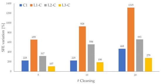 Table 5 reports the calculated values of SFE for untreated and laser-treated coated samples, plotted in Figure 7 as percentage variations with respect to the uncleaned samples. According to the wettability trend, it highlights that for all samples, the SFE increased as the number of cleaning steps increased, especially for the L1-C and L2-C samples. The variations of SFE remained poor for C and, most of all, for L3-C sample. Additionally, it must be noted that the values of SFE assessed for all laser-treated samples, i.e., L1-C, L2-C, and L3-C, remained lower than that observed for the untreated coated sample C.