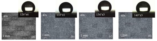 Laser surface treatment became an important alternative to most traditional techniques and was accepted by many industries, due to ease of automation, reliability, high precision, process flexibility, non-contact, and environmental friendliness [25]. In particular, laser texturing was demonstrated to be an excellent method to modify surface wettability of many different materials, from polymers [26,27] to metals [28,29], by changing the surface topography and/or chemistry [30]. Laser technique is able to create a wide variety of surface topographies, both at the micro and nanoscales [31,32], with large repeatability, with excellent control of the surface features shape and size, and with a minimum affectation of the bulk material, then, making this technique attractive to treat materials sensitive to mechanical damage [33].