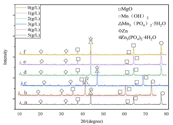 Figure 2 shows the X-ray diffraction spectra of different zinc oxide contents after a 15 min water bath in a phosphating solution. The results of pattern analysis and data show that the coatings are mainly composed of Mg, Zn, Mn and their compounds. However, the peaks and the intensities of different phases depend on the ZnO content. Firstly, there are five main peaks at 33.66°, 38.11°, 47.54°, 56.38° and 59.07° of 2θ; when ZnO is not present, the XRD pattern shows that the mixture is composed of MgO and Mg (OH)2. The PDF cards of XRD PDF#35-0821 and PDF#18-0787 are used for analysis. When the content of ZnO in a phosphating solution increases from 1 g/L to 3 g/L, the corresponding peak value of the main salt increases. According to the PDF cards of XRD PDF#04-0831 and PDF# 03-0426, it has been confirmed that there are some small grains of Zn and Mn 3(PO4)2·5 H2O and Zn3(PO4)2·4 H2O in the phosphide solution. When the content of ZnO is 4 g/L, the peak reaches the main peak. At this time, Mn3(PO4)2·5H2O and Zn3(PO4)2·4H2O are enriched, which can be seen from the scanning electron microscope images [30]. At the same time, the polyphase tends to be stable. When the ZnO content is further increased to 5 g/L, the peak value of elemental Zn continues to rise, and more phosphoric acid phases are obtained, resulting in the reduction of other mixed phases. It can be seen that the ZnO content has a significant effect on the formation of the coating. Therefore, the corrosion resistance of the coating decreases when the ZnO content exceeds 4 g/L.