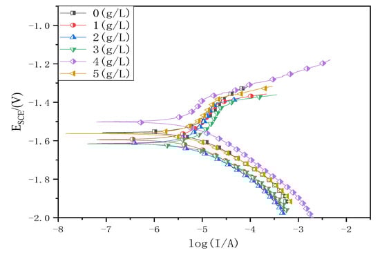 Figure 4 shows the polarization curves of ZnO with different concentrations in a 3.5% NaCl solution. Parallel experiments were carried out three times, excluding accidental error factors, and six groups of experiments were carried out each time. It can be seen from the figure that there are no obvious 10-anode arcs in the polarization curve without adding ZnO, and other anode arcs seem to show obvious pitting characteristics [32]. It can be concluded that this pitting potential is the penetration potential of the breakdown coating [33], and other parallel modes do not show pitting morphology. Pitting potential decreases as the ZnO concentration increases to 3 g/L, then sharply increases at 4 g/L, and then decreases again at 5 g/L. This indicates that there is an inflection point during the increase of ZnO content. The results show that the formation of these cracks in the coating with low ZnO content is due to the predominant manganese in the coating, which leads to the shrinkage of the coating. When the zinc oxide content is increased to 4 g/L and 5 g/L, the phosphate crystal changes into a flower-like structure due to the zinc phosphate in the coating. Small petals with flower-like structures grow on the gap of the crack boundary obtained with a ZnO content of 4 g/L. When the content of zinc oxide is 5 g/L, the membrane structure is similar to the flower structure of zinc oxide content of 4 g/L. However, the structural petals are large, and the spacing is large, so the cracks are difficult to cover. The tensile stress is caused by higher crystal hardness and more compact manganese phosphate. Therefore, the compressive stress of Mn coating is higher than that of Zn coating, and the advantage of Mn leads to many cracks on the surface of the substrate. On the contrary, when the content of ZnO is high, the weight percentage of zinc is greater than that of Mn, indicating that the coating is mainly composed of zinc compounds. Therefore, due to the high adhesion and low hardness of zinc, the advantages of zinc compounds in the coating can lead to the good filling of cracks between grain boundaries on the sample surface. It can be seen from Table 1 that the corrosion potential and corrosion current density (icorr) are both the smallest when the ZnO content is 4 g/L and the main salt concentration of coating forming remains unchanged, which are −1.420 V and 1.86 × 10−6 A/cm2. The results show that when ZnO content is 4 g/L, the corrosion resistance of the phosphating coating is the best, which is consistent with the analysis results of SEM morphology.