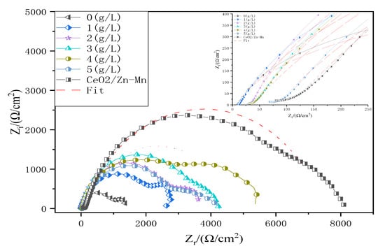 Figure 5 shows the electrochemical impedance spectra of ZnO and CeO2/Zn–Mn composite coatings with different concentrations in a 3.5% NaCl solution. As shown in the figure, except that no ZnO is added and no double arc of reactance occurs at 1 g/LZnO, the rest of the impedance spectrum is composed of two arcs of reactance, and the radius of the arc of reactance increases first and then decreases. When the ZnO concentration reaches 4 g/L, the arc radius of Zn–Mn reactance reaches the maximum, and the arc of CeO2/Zn–Mn composite coating is obviously larger than that of the Zn–Mn monolayer. The arc radius of the capacitive reactance is approximately equal to the electrochemical polarization resistance. When the conversion coating appears in the early stage, it indicates that it has certain corrosion resistance at this time, but it is easy to crack at the beginning of formation, resulting in local corrosion. With the passage of reaction time, the arc radius of the capacitive reactance increases, which indicates that the coating is growing continuously. When reaching a certain water bath time, the arc radius of capacitive reactance does not increase but decreases, and a double capacitive reactance arc appears. The former is the high-frequency capacitive reactance arc of charge transfer generated between the phosphating solution and coating layer [34], while the latter is the low-frequency capacitive reactance arc of the coating surface [35]. The low-frequency capacitive reactance arc has a larger radius, indicating excellent corrosion resistance. As can be seen from Figure 6, the longer the duration of blackening of Zn–Mn phosphating coating, the more significant the corrosion resistance effect. The results are consistent with the electrochemical polarization curve fitting results, indicating that the surface corrosion resistance is the best when pH = 3 and ZnO is 4 g/L.