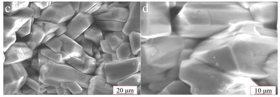 Figure 7 shows the SEM of CeO2/Zn–Mn composite coating in a phosphating solution for 15 min. In Figure 7a, the surface of the crystal particles is dense, covering the whole bottom of the riverbed. Almost no cracks can be seen, and the microstructure of crystal clusters is refined. Figure 7b shows that the surface cluster particles are rod-shaped crystal particles, which can be seen from the XRD diffraction pattern above and the EDS spectrum below. Rod-like grains are mainly composed of nano-CeO2 and some free cerium ions, which further refines the bed cracks on the surface of zinc manganese phosphate conversion coating. In Figure 7c, the surface grains are closely connected to each other at a ratio of 20 μm. Especially, in Figure 7d at 10 μm, the crystal grains have no scratches on the surface and effectively cover the bottom of the phosphating coating bed. At the same time, the existence of nano-CeO2 in the phosphating solution is easy to lead to negative overpotential migration during deposition, which is beneficial to the initiation of a crystal nucleus and the refinement of crystal grains. It shows that the addition of CeO2 is the key to improving the corrosion resistance, and the dispersion strengthening of the Zn–Mn monolayer is the core factor to improve the corrosion resistance.