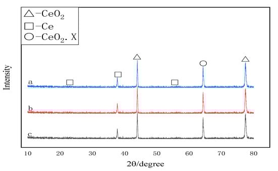 In recent years, nanoparticles have attracted extensive attention in the fields of material chemistry, biopharmaceuticals and environmental science because of their remarkable advantages in biocompatibility and environmental friendliness [16,17,18,19]. Especially, nano-SiO2, nano-TiO2, nano-ZnO and nano-ZrO2 have been applied to the corrosion and protection technology of alloy surfaces [20,21,22,23]. This is because the nanoparticles can play a very good role in the process of coating preparation and significantly improve the microstructure of the coating [24,25]. Ashassi [26] studied the corrosion resistance and hydrophobicity of nano-SiO2 in acrylic–silane polymer coating, which showed a significant improvement in corrosion resistance at 3.0 wt.% SiO2 with a maximum measured contact angle of 96.3°. Pommiers [27] prepared a nano-TiO2/Al2O3 composite coating on the surface of the alloy and studied and reported the hardness of the composite coating layer, which was significantly enhanced compared to the monolayer. Liang [28] investigated the effect of ZnO nanoparticles in Mg-rich epoxy coatings on the corrosion resistance and adhesion properties of AZ91D magnesium alloy, and the results showed that the corrosion resistance was improved by 1.2 orders of magnitude and the electrical conductivity was improved by more than 2 orders of magnitude. Previous studies have paid little attention to the effect of adding nanoparticles to the corrosion resistance of magnesium alloy conversion coating. In addition, it is not clear how the addition of nano-CeO2 changes the original coating growth mechanism. In addition, phosphate conversion coatings are an environmentally friendly surface treatment method that saves cost and energy for wear corrosion and lubrication to protect metal surfaces.