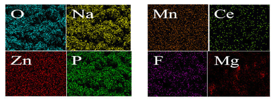 Figure 8 shows the X-ray diffraction of the CeO2/Zn–Mn phosphate composite coating after 15 min of a water bath in a phosphating solution. The results show that the modified composite membrane is formed on the basis of the mixture of Mn3(PO4)2·5H2O, Zn, Zn3(PO4)2·4H2O, MgO and Mg(OH)2 in the Zn–Mn phosphate conversion membrane. The surface is mainly composed of CeO2, Ce and CeO2 nanoparticles. The relative atomic ratio of Ce to O is 1∶2 by comparing the diffraction peaks and EDS spectra of the composite coating surface in Figure 9. The results showed that the nano-CeO2 content accumulated on the surface of the composite membrane rather than infiltrated into the interior, and the surface was mainly composed of Zn, P, O, Mg and Ce elements. In addition, the fewer defects in the coating layer, the better corrosion resistance [36]. Obviously, the corrosion resistance of the composite coating is better than that of the Zn–Mn monolayer, which is consistent with the EIS and electrochemical polarization results in the figure below.