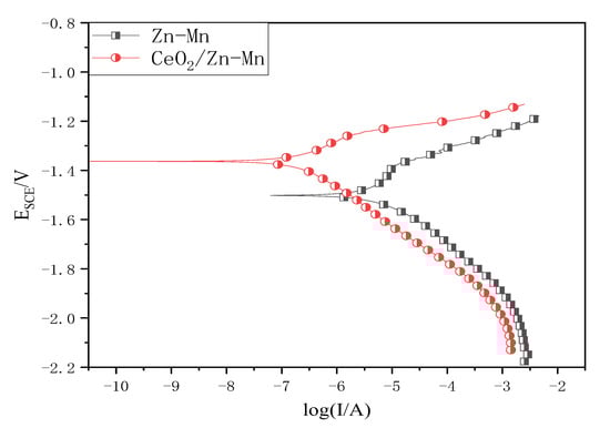 Electrochemical polarization curves of Zn–Mn phosphating coating and CeO2/Zn–Mn composite coating in 3.5% NaCl solution.