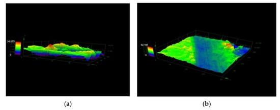 Figure 10 shows the electrochemical polarization curves of Zn–Mn phosphating coating and CeO2/Zn–Mn composite coating in a 3.5% NaCl solution. The anode region of the polarization curve shows obvious pitting corrosion characteristics. For magnesium alloy composite coating, the formation of this feature corresponds to the penetration potential of the coating [37]. Furthermore, the pitting/thin coating breakdown potential increased by about 100 mv, indicating that the small-amplitude sinusoidal potential signal was used to interfere with the system during the Tafel test analysis using an electrochemical workstation. Anode and cathode processes occur alternately on electrode 15, corresponding to anode and cathode arcs. The reason for the potential increase is that the addition of nano-CeO2 further refines the riverbed cracks on the surface of the Zn–Mn coating, making it look smaller under SEM. The composite coating deposited on the surface looks denser, and the corrosion potential increases. The more positive the corrosion potential, the better the corrosion resistance. According to the extrapolation method of the Tafel curve [38], when the conversion time is 25 min, the corrosion current density of the coating layer is the smallest. Corrosion potential reflects the corrosion resistance of the coating to some extent, but its priority is far less than the corrosion current density [39]. When the conversion time is 25 min, the corrosion current density is 9.538 × 10−7 A/cm2, which is one order of magnitude higher than that of the Zn–Mn monolayer. Figure 11 shows the 3D morphology of the coating layer under a laser confocal microscope. Figure 11a shows that the thickness of the single-layer coating is 27.743 μm, and Figure 11b shows that the thickness of the composite coating is 49.736 μm. The thickness of the 3D composite coating is consistent with SEM, which shows that it has obvious corrosion resistance, and the analysis results are consistent with SEM and EIS.