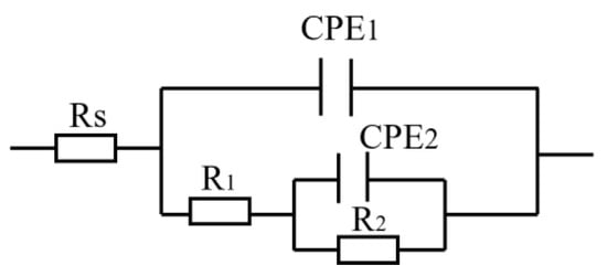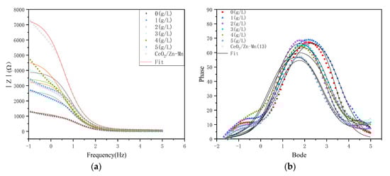 In the bode diagram Figure 12a, the ZnO value increases continuously when the ZnO content is not added to 4 g/L, and decreases at 5 g/L. The results show that when the content of ZnO is 4 g/L, the impedance performance of Zn–Mn phosphating coating is the best. The |Z| value of the CeO2/Zn–Mn composite coating is much higher than the |Z| value of the optimal ZnO content and has a stable passive response [40]. In Figure 12b, two peaks are obvious, indicating a bilayer structure. This is due to the fact that nano CeO2 makes up for the cracks in the bed of the Zn–Mn monolayer. That is to say, AZ91D alloy is combined with a proper amount of Zn–Mn phosphate, which makes the corrosion resistance stronger. In Figure 13, the fitting data is close to the experimental data, and the resulting error is small. Therefore, the equivalent circuit diagram can be used to fit the experimental data. Rs represents the resistance of the solution, while R1 and R2 represent the charge transfer resistance between the coating and the solution and the reaction resistance of the coating, respectively. Due to the rough surface and uneven electrochemical performance of magnesium alloy conversion coating, phase angle elements are often used instead of capacitors to explain the behavior of high-frequency capacitive arcs. CPE1 and CPE2, respectively, represent the phase angle elements of the corrosion products and the electric double layer at the reaction interface [41]. The larger the fitting resistance, the better the corrosion resistance, which is consistent with the results obtained by the polarization curve.