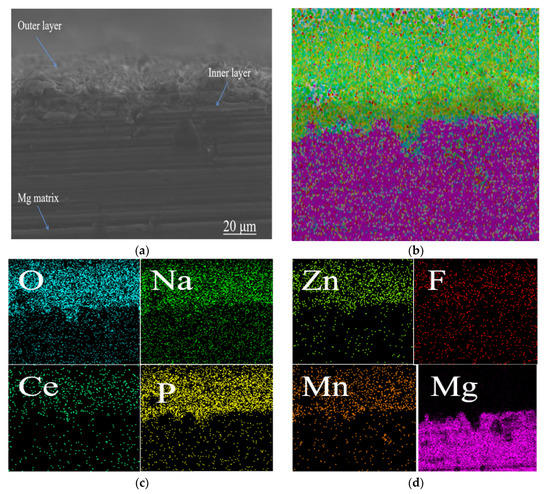SEM cross-section morphology and EDS spectra of CeO2/Zn–Mn composite coatings: (a) Nano-CeO2/zinc manganese composite coating; (b) EDS spectra of nano-CeO2/zinc-manganese composite coatings; (c) Distribution of O, Na, Ce and P elements in composite membranes; (d) Distribution of Zn, F, Mn and Mg in composite coating.