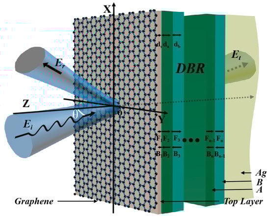 We consider a sandwich-like structure of graphene-based TPS with Ag as the substrate, as shown in Figure 1. The DBR is considered as a layered structure, and the transmitted and reflected electromagnetic waves in each layer are marked as F and B, respectively. Here, layer A is poly 4-methyl-pentene (TPX, ) and layer B is Si (). In the terahertz (THz) frequency range, the TPX material is a transparent material, and the nanoscale Si material also possesses excellent optical properties. The thickness of A and B are and , and the period of n = 11. The top layer has the thickness and the refractive index . The frequency-dependent permittivity of silver is calculated by the Drude model , including high-frequency constant , plasmon frequency , and scattering rate . The linear conductivity of graphene can be approximately expressed as [35]: