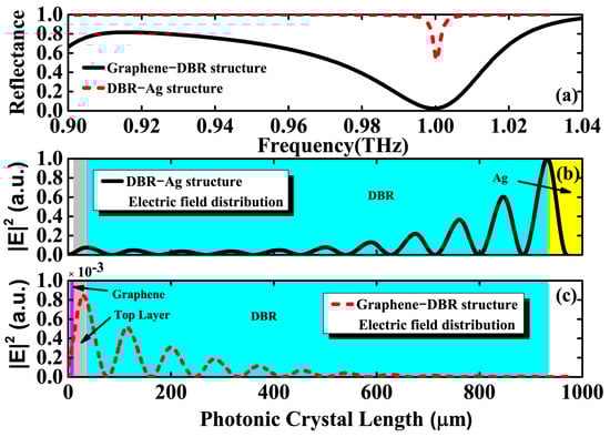 (a) The reflectance spectra of the graphene-DBR structure (red dashed line) and the DBR-Ag structure (black line). (b) The DBR-Ag structure (black line). (c) The calculated electric field of the graphene-DBR structure (red dashed line).