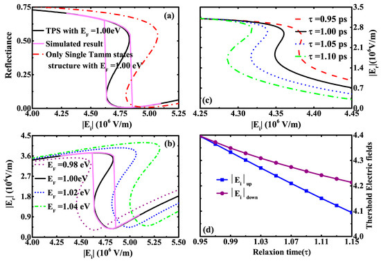 Next, we consider the variation of the OB phenomenon generated by the graphene-based TPS under different conditions. Due to the highly localized field enhancement in the graphene-based TPS, when the field strength E increases, the non-linear part of the graphene conductivity cannot be ignored, which excites and generates the OB phenomenon and causes a reduction in the OB threshold. The OB phenomenon of the reflectance and incident electric field at different Fermi energy of graphene are shown in Figure 4a. The dependence of the reflected electric field on the incident electric field for different Fermi energy of graphene are shown in Figure 4b. When the graphene Fermi energy is increased from 0.98 to 1.04 eV, the OB threshold is rapidly increased, and the hysteresis loop width is significantly enhanced. By adjusting the Fermi energy of graphene, the incident electric field needed to maintain the OB can be adjusted. It can be seen from Figure 4a that the OB threshold excited in the TPS (black dash line) is lower than that excited in the graphene-DBR structure (red dash–dot line). According to Figure 4c,d, we find that OB is also sensitive to the relaxation time of graphene. It is clear that when the relaxation time , the hysteresis width . As the relaxation time increases to , the hysteresis width increases to . Overall, the OB threshold was significantly reduced, while the hysteresis curve width increased by 5.8 times. If the relaxation time is small enough, and have a tendency to overlap, the hysteresis curve disappears, and the OB is smeared out. The threshold value and hysteresis width of the OB in the graphene-based TPS structure are both flexible and controllable in comparison to the OB excited by conventional micro/nano metallic devices. The dynamic modulate properties of graphene provide another viable idea for the fabrication and design of OB devices. Therefore, the concept of graphene-based TPS has a positive role in reducing the threshold of the OB. The pink dotted lines in Figure 4a,b show the results of COMSOL Multiphysics. The curve plotted at the Fermi energy of grapheme EF = 1.00 eV is taken as a reference; the finite element (FEM) method is applied to check the linear and non-linear response effects of the proposed structure, and the rigorous coupled-wave theory is adopted to verify the accuracy of the numerical results. In the FEM method, the setting of the structural parameters is consistent with the mathematical calculation. According to the figures, the calculation results of COMSOL Multiphysics are in accordance with the mathematical calculation method, which proves the accuracy of the mathematical calculation. Therefore, the concept of the TPS has a positive role and practical value in reducing the threshold of OB.