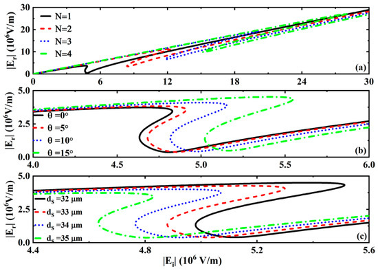 In addition to the influence of the graphene parameters, the OB is also affected by the angle of incident light, the number of graphene layers, and the thickness of top layer, as shown in Figure 5. Figure 5a shows the dependence of the OB on the number of graphene layers (N). Due to the thin thickness of the monolayer graphene (only 0.34 nm), its electrical conductivity can be approximated as . When the number of graphene layers N = 1, the hysteresis width is about . When the number of graphene layers is N = 2, the hysteresis width is about . Therefore, as the number of graphene layers increases, both the optical bistable threshold and the hysteresis width increase simultaneously. The above results remind us that the optical bistability can be controlled by changing the number of graphene layers. In addition, under the condition that the other parameters are not changed, it can be seen from Figure 5b that the reflected electric field and incident electric field are affected by the change in the incident angle. As the angle of incidence increases from to , the OB threshold increases and the hysteresis width increases, as shown in Figure 5b. When the incident angle is reduced to , the optical bistable phenomenon of the reflected electric field still exists. This is mainly because the heterstructure of the TPS is under the normal incidence of light, which leads to the local enhancement of the electric field in the graphene, thereby providing the necessary conponent for the excitation of the low threshold OB phenomenon. Finally, we discuss the influence of the top layer with different thickness (ds) on the reflection OB phenomenon, as shown in Figure 5c. The top layer is the dielectric layer of the cavity, and its change will affect the OB phenomenon of the TPS mode excitation. Therefore, it is necessary to further analyze the influence of the top layer thickness on the variation of the hysteresis curve. As show in Figure 5c, it can be seen from observation that as the top layer thickness increases, the thresholds of the reflectance OB and the reflected electric field OB both increase, and the width of hysteresis loop widens at the same time, which shows that the top layer thickness also has an obvious regulating effect on the OB phenomenon. In general, it is very important to choose the top layer thickness reasonably, and the variation in the OB hysteresis curve caused by the change in the top layer thickness will provide an important reference for the design of appropriate OB devices.