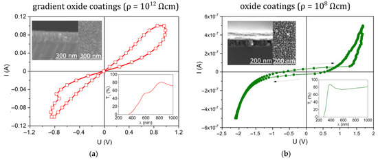 Current to voltage (I–V) of transparent (a) gradient [11] and (b) oxide [10] coatings (Ti,Co)Ox that exhibit a memristive effect. In the insets, SEM images of surface and cross-section, as well as transmission characteristics, are shown.