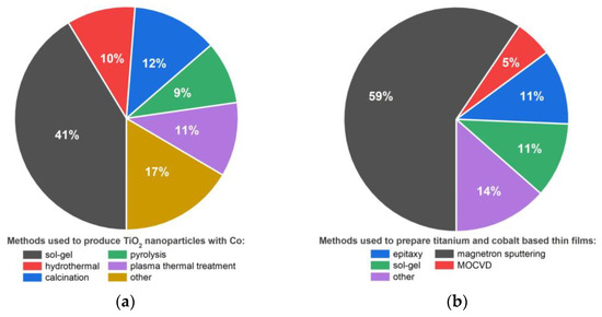 Methods used to prepare TiO2 nanoparticles doped with Co (a); preparation methods of thin films based on Ti and Co mixed oxides (b) based on the ScienceDirect database from 1980 to 2022.