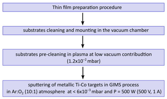 Materials based on mixtures of Ti and Co oxides have recently gained attention because of their wide range of applications in electronics. Today, there are only a few reports on Co-doped TiO2 [1,2,3,4,5], but mainly in the form of nanopowders, nanoparticles, or nanowires, while thin-film work itself is in a minority. One of the possible reasons for this fact is that the properties of such oxide mixtures are strongly related to the preparation method and additional postprocessing, such as high-temperature annealing. Therefore, a direct comparison of their properties is impossible. There exist only a few reports related to complex modification of the structural, surface, optical, or electrical properties of titanium dioxide as a matrix by doping with Co [6,7,8,9].