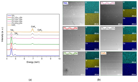 In Figure 6b, SEM images of surface topography with EDS maps of elemental distribution of (Ti,Co)Ox thin films are shown. It was found that films with 3 at.%, 19 at.%, 44 at.%, 60 at.%, and 100 at.% of cobalt content in the TiOx matrix were prepared. EDS maps indicate a homogeneous distribution of Ti, O, and Co, as well as a lack of agglomeration effects. The absence of areas with a clearly higher concentration of cobalt should be emphasised because it proves the high quality of sintered targets and the possibility of manufacturing Ti-based oxide coatings with a homogeneous distribution of Co. Detailed results of the EDS analysis are collected in Table 1.