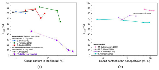 Films containing a low amount of cobalt are characterised by a level of transparency similar to that of undoped TiO2 or the mentioned nanoparticles (ca. 80%). Above 10 at.% cobalt results in a significant reduction of transmission (Figure 8a). However, the literature lacks comprehensive analyses of titanium oxide coatings with neither low nor high Co content. A significantly different character can be seen for nanoparticles (Figure 8b) [9,21,25,27]. These nanomaterials have a similar value of the light transmission coefficient (from 60% to 90%). It is difficult to determine the reason for the lack of changes with the increase in Co content. This can be determined by the manufacturing method or may be related to the fact that the core of the nanoparticles is TiO2 and cobalt is located in its shell [9,25,27]. The solution to this shortcoming may be additional annealing, which will almost certainly cause oxygenation of the film structure.