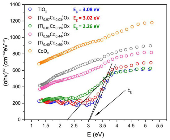 Based on transmission characteristics, the Tauc plots (for indirect transitions) were obtained and the optical band gap was estimated (Figure 9). The Egopt values for the TiOx and (Ti0.97Co0.03)Ox films were very similar and equal to 3.08 and 3.02 eV, respectively. The increase in the Co content resulted in a decrease in the Egopt value. In the case of the film with 19 at.% of Co, 2.26 eV was noticed. For films with greater amounts of cobalt, a transmission level that was too low did not allow us to determine the value of the optical band gap. However, it should be noted that the results obtained are consistent with reports in the literature [6,56]. The results available for thin films show the crucial role of their form and method of preparation. There is a general tendency for the value of Eg to decrease with the increase of Co content [7,21,25,27,52,53,54,57] (Figure 10).