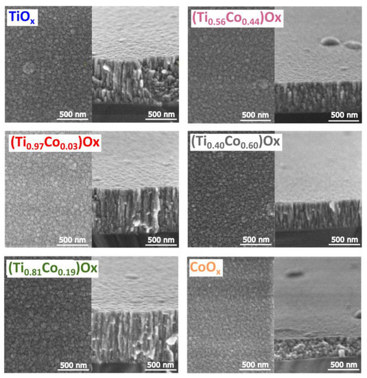 SEM images of the surface and cross-sectional topography of TiOx, (Ti,Co)Ox, and CoOx thin films.