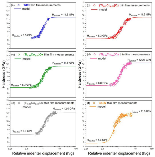 Hardness of (a) TiOx, (b) (Ti0.93Co0.03)Ox, (c) (Ti0.81Co0.19)Ox, (d) (Ti0.56Co0.44)Ox, (e) (Ti0.40Co0.60)Ox and (f) CoOx oxide thin films.