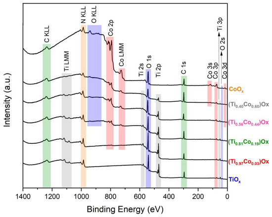 XPS survey spectra of the as-deposited TiOx, (Ti,Co)Ox, and CoOx thin films.