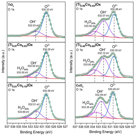 Figure 18 presents the XPS spectra for the O1s peaks recorded for the prepared TiOx, (Ti,Co)Ox, and CoOx thin films. Deconvolution of the multipeak (Figure 19a) showed that it consisted of three peaks, centred on: (i) 530.3 eV, attributed to lattice oxygen [61,62,66,67]; (ii) 532.1 eV, related to the presence of hydroxyl groups (OH-) on the surface [61,62,66,67]; and (iii) 533.6 eV, related to the water molecules adsorbed on the surface (H2Oads) [61,62,66]. The differences in the positions of the O1s doublet peaks are very small, i.e., below 0.5 eV. Taking into account the intensity of the multipeak O1s (Figure 19b), it could be concluded that the surfaces of (Ti,Co)Ox with 44 at.% and 60 at.% cobalt, as well as CoOx thin films, are more likely to absorb OH- from the surrounding environment than TiOx and (Ti,Co)Ox with 19 at.% or 3 at.% Co. Furthermore, with increasing Co content, the level of H2Oads also increased from 2% to 15%.