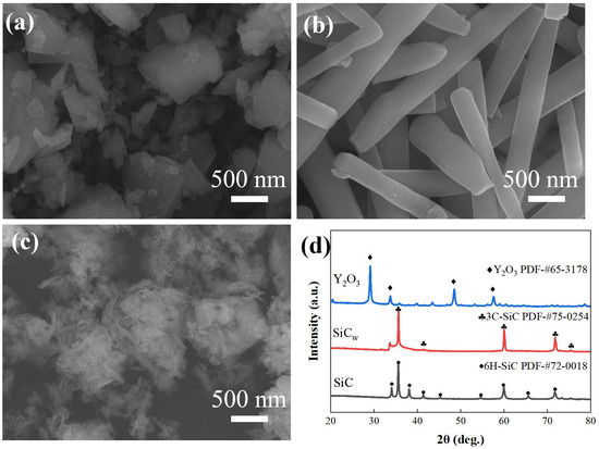 SEM images of (a) SiC powder, (b) SiCw powder, (c) Y2O3 powder, and (d) the XRD patterns of the raw powders.