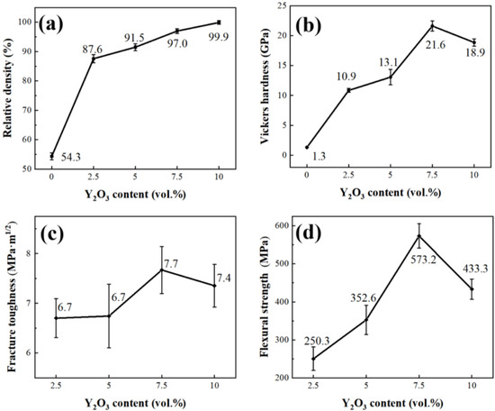 The Vickers hardness (HV, GPa) of SiC composite ceramics with different content of Y2O3 was tested by a Vickers hardness tester (HV-50Z, Huayin, Laizhou, China) with a load of 20 kgf for 15 s. The length of the diagonal indentation (2a) and the final Vickers hardness value were obtained by the standard GB/T 4340.1-2009.