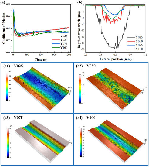 Figure 7b depicts the wear track profiles of SiC/SiCw-Y2O3 composite ceramics. It can be seen both the width and depth of the wear track of composite ceramics decrease in groups with Y2O3 content ≤7.5 vol.%. As the Y2O3 content continues to increase, the width and depth of the wear track of Y100 increase, but it is still smaller than Y050. Besides, the wear scar profiles of Y075 and Y100 are smoother than Y025 and Y050, indicating the more compact microstructure and better mechanical properties of the latter groups. Figure 7c1–c4 vividly displays the 3D morphology of the wear track on each sample surface. These images exhibit the depth and width of the wear track (consistent with Figure 7b) and can reveal the surface roughness inside the wear track. As can be seen, the wear tracks of Y025 and Y050 possess larger roughness than Y100 and Y075, and the Y075 is the smallest. Generally, in the case of the same materials type, the smoother the surface, the lower the friction coefficient, and the better the wear resistance [43,44].