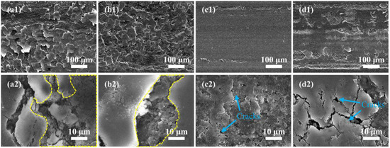 The SEM morphologies of the wear track of SiC/SiCw-Y2O3 composite ceramics with different Y2O3 contents. (a1,a2) Y025; (b1,b2) Y050; (c1,c2) Y075; (d1,d2) Y100. The yellow-dotted polygon outlines the sintering holes filled with wear debris.