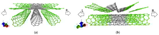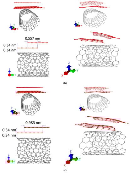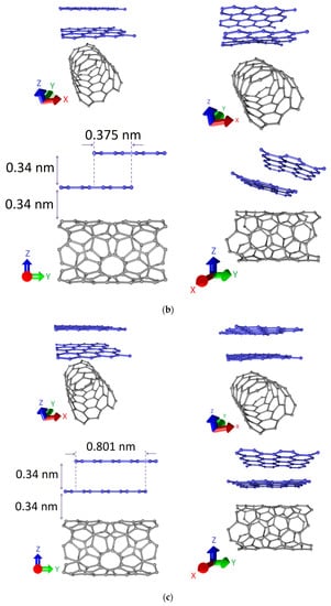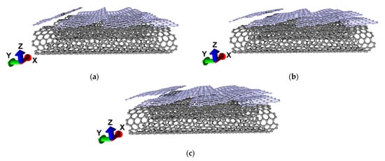 As can be seen, in the cases of models V1 and V2, the sheets of bilayer graphene were deformed as a result of optimization of the atomic structure. They are located at a certain angle with respect to the nanotube surface. For model V3, the degree of deformation of bilayer graphene was minimal. The graphene sheets were arranged horizontally with respect to the nanotube surface. Differences in the orientation of graphene sheets with respect to the nanotube surface between the models are explained by the small size of graphene sheets in the armchair direction (along the Y axis) in the case of models V1 and V2. The nanotube (6,3) was almost not deformed due to its small size.