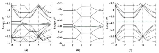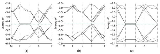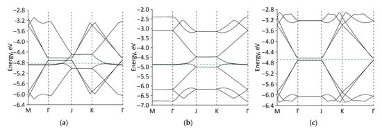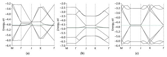 To reveal the electronic structure features of graphene/SWCNT hybrid films with island-type topology, the energy band diagrams were calculated. The band structure was sampled along a path M–Γ–J–K–Γ within the first Brillouin zone. One of our tasks was to analyze what features of the electronic structure and properties of bilayer graphene and (6,3) and (12,8) SWCNTs are manifested in the graphene/SWCNT hybrid structures. Figure 4, Figure 5 and Figure 6 show the calculated band diagrams near the Fermi level for supercells of graphene/SWCNT (6,3) hybrid structures. These figures also show the band diagrams of a nanotube (6,3) and bilayer graphene, which are part of the supercell of the graphene/SWCNT (6,3) hybrid structure. Based on the results of the analysis of the presented diagrams, the following patterns can be identified. The band diagrams of graphene/SWCNT (6,3) hybrid structures of all three models contain characteristic features of the electronic structure of both bilayer graphene and (6,3) SWCNTs. The contribution of bilayer graphene to the energy profile near the valence band maximum (VBM) and near the conduction band minimum (CBM) is clearly seen between the highly symmetrical J and K points of the Brillouin zone. The contribution of (6,3) SWCNTs to the energy profile near the VBM and CBM manifests itself between Γ and J points. Between M and Γ, as well as between K and Γ points, the joint influence of bilayer graphene and (6,3) SWCNTs on the patterns of the energy profile of the graphene/SWCNT (6,3) hybrid structure.