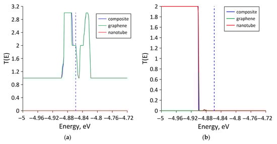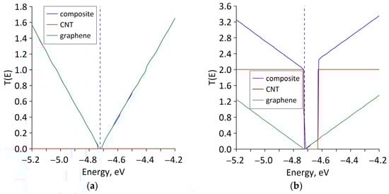 Transmission functions of the graphene/SWCNT (12,8) hybrid structure and its individual components for model V1: (a) current transfer along the X axis; (b) current transfer along the Y axis. The dotted vertical line marks the Fermi level of the graphene/SWCNT (12,8) hybrid structure.