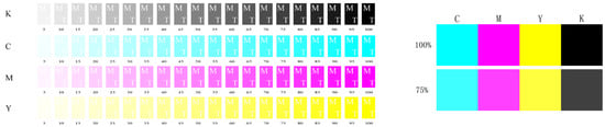 Regarding the control of the optimal field density value of four-color ink, color management is the core of not only proofing and printing data, but also the results of the entire reproduction process [17]. Because the field density (ink layer thickness) has a great impact on the sample and the quality of the print, when the field density is too large, the network increases, and the print is rough; however, when the field density is too small, the color saturation is insufficient, so the field density must reach the optimal point. In short, the best field density is 75% to 80% of the dotted area with a reasonable range of increase under the premise of the maximum field density value, that is, the field density at the maximum K value [18].