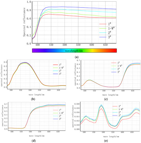 As discussed above, the reflectance spectra revealed a great deal of color-related information including the hue, saturation, depth, intensity, and homochromatic heterogeneity of the sample color. As shown in Figure 3a, the color performances of the substrate surfaces were, from high to low: 3#, 2#, 1-W#, 1#. Experimental sample 3# outperformeds the other three experimental samples for each indicator of color performance. In the reflectance of the CMYK four-color spectrum, the C value varies significantly in the band 450–500, the M value is 620–700, and the Y value is 500–700. From best to worst, the sample order was: 3#, 2#, 1-W#, 1#. As per the K values of the other three samples, the spectral curve of 1# showed the lowest hue and saturation. The most stable and colorful sample according to the comprehensive analyses was sample 3#.