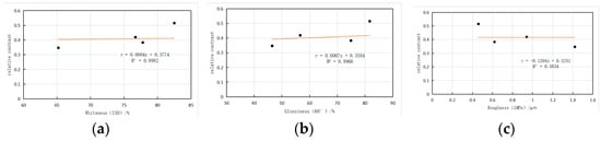 Correlation between substrate whiteness, gloss, roughness, and relative contrast: (a) whiteness; (b) glossiness; (c) roughness.
