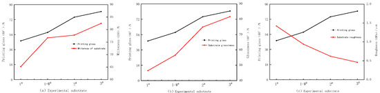 Figure 5 demonstrates a strong correlation between the surface gloss of the substrate and both the whiteness and gloss of the print. The trend is positively correlated, with an increase in print gloss as substrate whiteness and surface gloss increase inversely. Lower roughness also contributes to higher glossiness. When printing on MDF board, a roller-coating process with high surface glossiness is necessary for meeting high requirements.