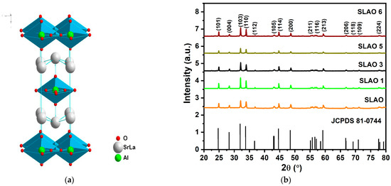 (a) A visualization of the crystalline structure of the pure tetragonal SrLaAlO4. The green, red, and gray spheres correspond to Al, O, and Sr/La atoms, respectively. The blue color shows octahedrons. (b) X-ray diffraction patterns of the pure SrLaAlO4 and SrLaAlO4:Tm Yb phosphors.