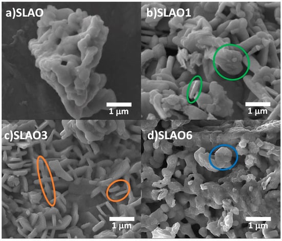 The SEM images in Figure 2 show the morphology of the SLAO, SLAO1, SLAO3, and SLAO6 phosphors. The average size of the SLAO:Tm,Yb phosphors was determined from the SEM images, and we employed Image J software. The average particle size for each sample was calculated by averaging the sizes of 200–300 microparticles. We also calculated the particle size distribution for each sample, see Figure S1 in the Supporting Information. Figure 2a shows the SEM image for the pure SLAO (undoped host). We observe coalesced particles with irregular shapes and sizes of 0.3–1 μm. If the concentration of the Yb3+ dopant is incremented to 1.0 mol% (SLAO1), it now observes particles of irregular shapes mixed with micro-rods; see the green circles in Figure 2b. The average length of the bars was 1 μm. The SLAO3 phosphor shows mostly micro-rods with an average length size of 0.68 μm and an average width of 0.15 μm (see the orange circles in Figure 2c). Some irregular particles are also observed with an average size of 0.93 μm. Moreover, the SLAO6 phosphor made with 6 mol% of Yb showed a high agglomeration of particles, and the micro-rods disappeared, as seen in Figure 2d, see the blue circle. Overall, the SEM results demonstrate that raising the co-dopant concentration of Yb3+ increases the coalescence degree of the SLAO: Tm,Yb microparticles. This phenomenon has been observed in previous rare-earth-doped oxide phosphors [18]. Possibly, an imbalance of charges occurred at higher Yb3+ concentrations, which avoids the formation of particles with well-defined morphology [18].