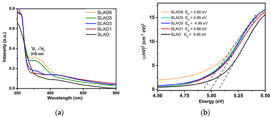 The absorbance spectrum of the undoped SLAO phosphor (see Figure 3a) shows a UV absorption band at 230 nm (edge band gap absorption). The absorbance spectra of SLAO:Tm,Yb exhibits a peak at 318 nm, which is attributed to the 1D2 → 3H6 transition of Tm3+ [19,20]. Additionally, the intensity of the band at 318 nm increases with the Yb concentration, which is consistent with the energy transfer from the Yb sensitizer to the Tm ions [19,20]. The optical band gap values for both the undoped SLAO and SLAO1–SLAO6 phosphors were calculated from the absorbance spectra using the well-known Tauc plot procedure, which provides plots of (αhv)1/n vs. energy (eV). The band gap is obtained from those curves by intersecting the linear section with the energy axis (αhv = 0), as seen in Figure 3b. α is the absorption coefficient, hv is the photon energy, h is the plank constant, and v is the frequency of light. n was taken as ½ because is a direct band gap material [21]. The optical band decreased with the Yb concentration from 1 to 6 mol%, as seen in Figure 3b. The pure host has a band gap value of 5.06 eV. Furthermore, the refractive indexes of the phosphors were calculated using the following formula [22]:
