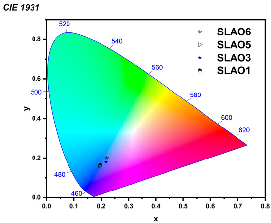 The Commission International de I’Eclairage (CIE) color coordinates were calculated from the PL emission spectra of SLAO:Tm, Yb phosphors, as seen in Figure 5. The color coordinates were (0.21824, 0.17945), (0.19368, 0.15826), (0.22078, 0.20033), and (0.19624, 0.16416) for the SLAO1, SLAO3, SLAO5, and SLAO6. All those coordinates are located in the blue region of the CIE map.