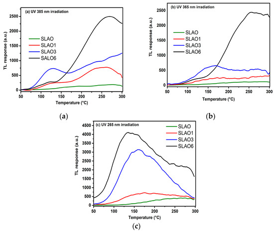 Thermoluminescence (TL) properties of the SLAO, SLAO1, SLAO3, and SLAO6 phosphors were studied. Firstly, the phosphors were exposed to different UV sources (265 or 365, or 385 nm) for 10 min to create traps in the samples. After UV irradiation, the samples were heated in the range of 50 °C–300 °C to release the electrons confined in the traps of the samples. TL spectra of the SLAO, SLAO1, SLAO3, and SLAO6 samples after irradiation with a 385 nm source are presented in Figure 6a. The TL signal presents two main peaks, one around 125 °C and the second around 250 °C–260 °C. The most intense TL response was obtained for the SLAO6 sample. Since the TL emission is proportional to the content of defects in the samples, the SLAO6 sample should have the highest content of defects [38,39,40,41]. The TL response of the SLAO, SLAO1, SLAO3, and SLAO6 samples (previously irradiated with 365 nm) is shown in Figure 6b. In this plot, the SLAO and SLAO1 samples present a weaker emission in comparison with the SLAO3 sample, which exhibited a wide peak at 160 °C. The most intense TL emission is also obtained for the SLAO6 sample, which reveals a prominent peak band at 250 °C. This peak could be due to the intrinsic effects of the crystal lattice rather than new defects or color centers induced by the higher Yb concentration [42,43]. Figure 6c shows TL responses of the SLAO, SLAO1, SLAO3, and SLAO6 samples after 265 nm irradiation. Irradiation with this last UV wavelength produced higher TL emissions than the 385 nm and 365 nm wavelengths. Moreover, the undoped SLAO sample presents a weak TL response. The SLAO1 sample shows a weak TL band in the range of 140–180 °C, while the SLAO3 and SLAO6 samples show TL peaks at 160 °C and 140 °C [44,45,46], respectively. Previous reports in the literature about the TL properties of phosphors doped with Yb demonstrated that the introduction of Yb ions into the lattice sites caused the formation of oxygen vacancies, which act like electron traps with high activation energy [44,45,46,47]. Thus, the SLAO6 sample, which presented the highest TL emission, should have the highest content of oxygen vacancy defects.