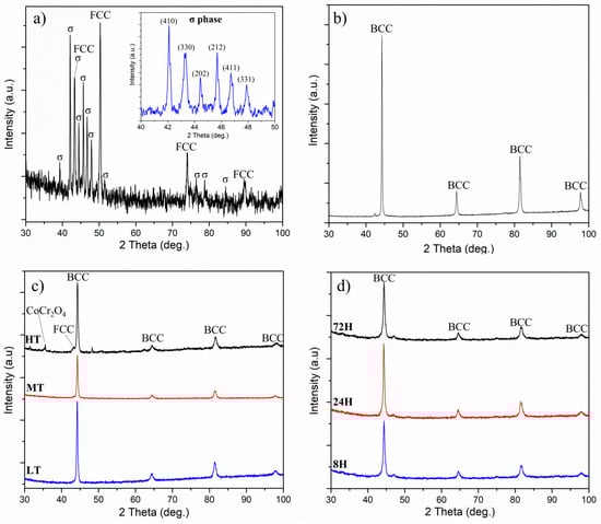 Figure 1 presents the X-ray diffractograms of the suction-cast bulk CoCrFeMnNi0.8V, the gas atomized powder and the HEA coatings deposited at different temperatures (LT, MT, HT) by HVOAF. According to the results, the bulk material (Figure 1a) corresponds to the sigma intermetallic phase and an FCC phase. In contrast, the gas atomized powder (Figure 1b), LT (Figure 1c) and MT (Figure 1c) coatings consist of a single BCC phase. In the case of the HT coating (Figure 1c), the main peaks correspond to BCC, but peaks of lower intensity correspond to FCC and oxides. Heat treatment of the LT coating at 500 °C for up to 72 h (Figure 1d) did not lead to any significant changes in the X-ray diffractograms. The coating retained the phase constitution.