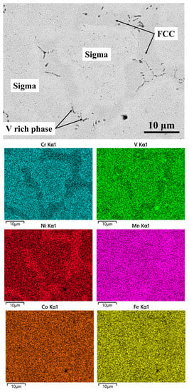 Figure 2. Microstructure (BSE mode) and elemental map of CoCrFeMnNi0.8V fabricated by suction casting.
