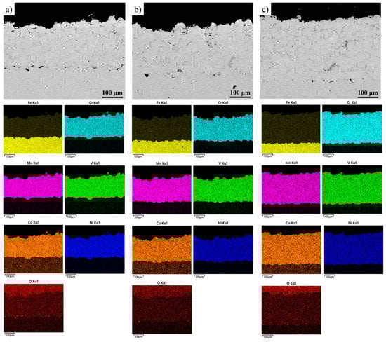 Figure 5. Microstructure and elemental map of CoCrFeMnNi0.8V coatings deposited under different spraying temperatures: (a) LT, (b) MT, and (c) HT.