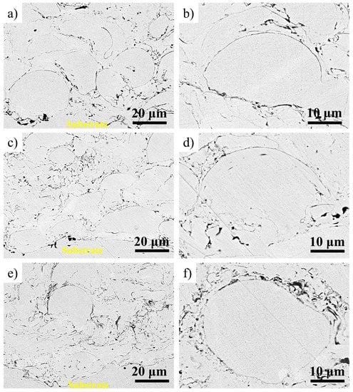 Figure 6. Microstructure of CoCrFeMnNi0.8V coatings deposited under different spraying temperatures at higher magnification: (a,b) LT, (c,d) MT, and (e,f) HT.