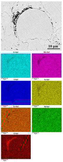 Gas-atomized CoCrFeMnNi0.8V particles consist of a single BCC solid solution with an average size of 20–50 μm (Figure 1b and Figure 3a). The particles appear to have been properly melted and solidified with no porosity and minimal defects (Figure 3b). The chemical composition of the powder is close to the nominal composition of the system, with slightly lower V content and higher Cr content (Table 2). Elemental mapping of the powder indicates the good distribution of the elements, with Ni appearing to be segregated (Figure 4).