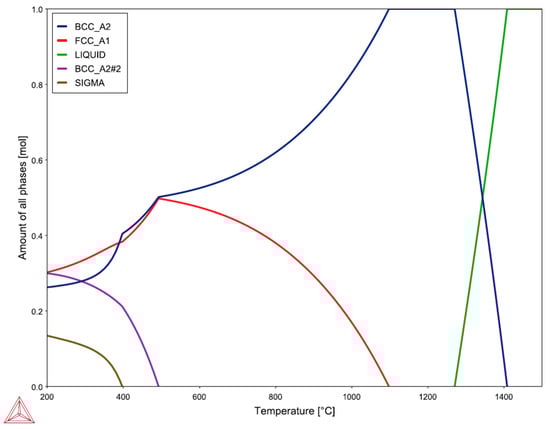 The one-dimensional phase diagram (Figure 8) provides valuable insight about the equilibrium phase constitution of CoCrFeMnNi0.8V. Between the liquidus and 1100 °C, BCC is the only anticipated phase. However, between 400–1100 °C, a dual BCC and FCC microstructure is expected. The volume fraction of FCC increases with decreasing temperatures. Finally, sigma formation is expected at approximately 400 °C.