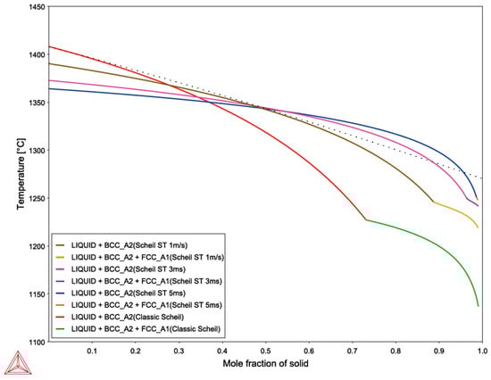 Figure 9. Comparison of the solidification phase formations generated using the classic Scheil model, and Scheil-with-solute trapping model with solidification speeds of 1, 3, and 5 m/s.